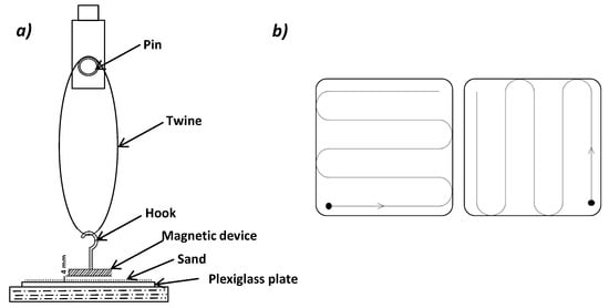The physical separation and quantification procedure was performed on a 20 g test portion per unit test on ten individual test specimens of about 2 g. The test portion was obtained by the second reduction procedure, and the separation of the magnetizable particles was carried out according to the schematic illustration presented Figure 2. The separation was carried out for each test specimen of about 2 g by arranging the SCFS specimen in a thin layer distributed on a plexiglass plate and holding a magnet wrapped in aluminum foil above. The magnetic device was kept at a distance of 4 mm for all tests in order to not change the magnetization property. The plexiglass plate was moved under the magnet to cover the entire surface of the test specimen. The magnetization pattern is provided in Figure 2b. The magnetized particles were regularly removed from the surface of the foil and stored in a previously weighed container. Magnetization was considered complete when, after several successive passes of the magnetic device over the reshuffled SCFS test specimen, no additional particles were magnetically attracted.
