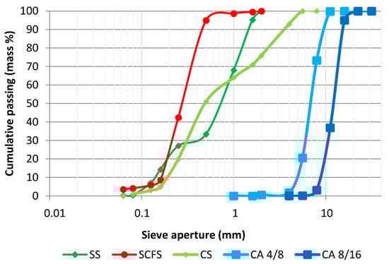 In order to understand the influence of SCFS better highlighted in the mortars, the by-product was comprehensively characterized by all the tests previously cited and in comparison to the natural sand SS used in SM. The natural suitable aggregates (CS, CA 4/8 and C 8/16) used in the concretes were only characterized according to the tests necessary for the formulation of the cementitious materials: the sieving test as well as the particle density and water absorption tests.
