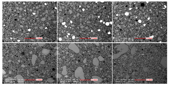 The observation of the various magnetic particles also led to the conclusion that, during the mixing of cementitious materials, a modification of the grain size of the sands is to be considered because certain aggregated grains present a weak bond between them. This modification of the particle size distribution can lead to a loss or gain of mechanical strengths depending on whether it involves a higher water demand [15,31,34,44] or a filler effect [20,25,26,42].