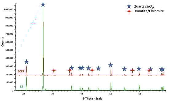 The crystallographic composition of the sands determined by X-ray diffraction confirms that the main element of the sands is silica present as quartz. Figure 5 shows examples of diffractograms for the two sands. It highlights the quartz peaks as well as other less important peaks for SCFS, which are characteristics of other secondary mineral phases. One of the phases identified is donatite, also called chromite, which is mainly composed of chromium but also contains iron and sometimes traces of aluminum and magnesium.