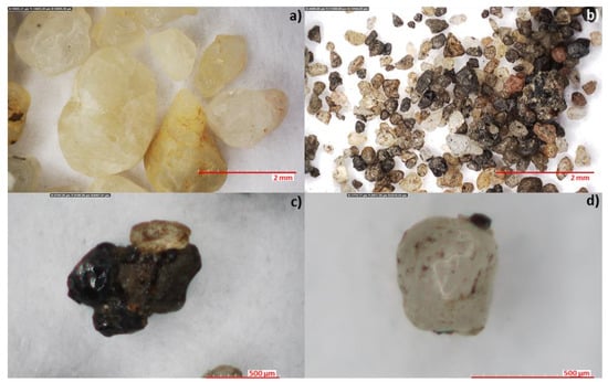 The digital microscope observations confirmed the different morphologies of SCFS and SS (Figure 6). The different shades of beige and yellow usually found in siliceous sands were observed for some particles. Other SCFS grains show a darker color (Figure 6c) which may be due to the presence of thermally degraded phenolic resin residues. Some particles may also be aggregated, as shown in Figure 6d.