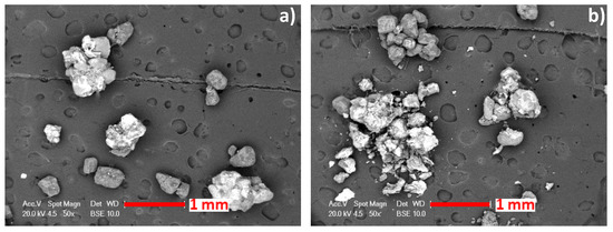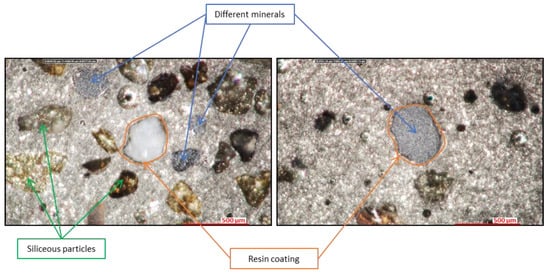 Additional observations on coated sand particles confirmed the presence of black degraded chemical resin residues around some spent foundry sand particles (Figure 7). They also highlighted the presence of some metallic grey colored particles.