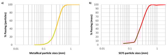 The magnetic separation of some SCFS metallic particles indicated that their mass percentage was 6.85% for the 20 g test portion. The average value is specifically 6.79 ± 0.95% for the 10 test specimens of about 2 g. The total mass of these particles corresponding to 1.4 g, a study of the particle size by the traditional sieving method is difficult to achieve. This explains the methodology developed with the digital microscope. The particle size distribution obtained for these magnetized particles is presented in Figure 8a. The results obtained by the sieving method for SCFS are also recalled in Figure 8b. A difference between the two curves can be observed at the beginning because the measured magnetized particles do not have any grains smaller than 150 µm, whereas they represent 6% by mass of the SCFS particles. However, the two curves show a similar particle size distribution thereafter. The particles smaller than 500 µm, which represent 95% of the mass of SCFS, account for 90% of all magnetized particles measured.