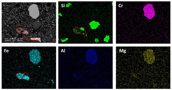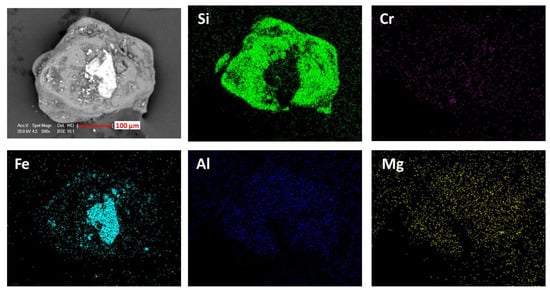 Several mappings carried out on some coated and polished magnetized particles confirmed the presence of silica as well as other metallic elements present in the form of composites. Figure 9 shows an example of mappings with a grain composed of a mixture containing mostly chromium, then iron, aluminum and magnesium. This type of particle, frequently found, is associated with chromite identified by XRD. On this same figure, the possibility of aggregation of silica grains and iron particle from the metal casting is highlighted (red outline).