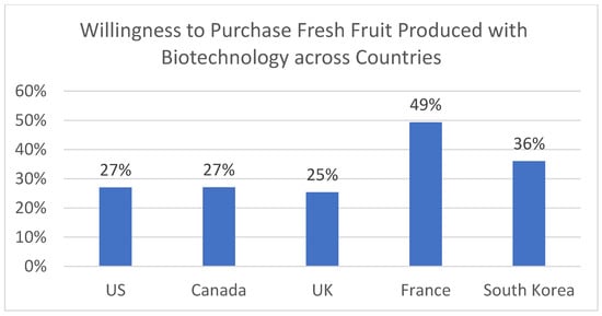 The survey results show an overall low acceptance of biotechnology produced fresh fruit across countries (Figure 1), which is consistent with previous findings. Interestingly, France has a relatively high percentage of respondents (49%) who were willing to purchase biotechnology produced fresh fruit than other countries, followed by South Korean respondents with a share of 36%, while the percentage was about 27% for the US and Canada and about 25% for the UK. Although previous research showed a low support of GM foods in Europe [16,24,36,38], our survey indicates that French respondents are more willing to purchase biotechnology produced fresh fruit than consumers in other considered countries. This could be attributed to several factors such as the term used in this study (GMO vs. biotechnology), product of interest (fresh fruit vs other crops), different survey times, and the number of participants. Moreover, it is worth noting that the level of concerns toward GM foods has been declining in European countries in recent years [18,19].