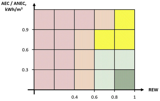 The last step of methodology is to assess the relationship between WWT quality and energy costs. Authors suggested the Q/E dependency matrix, which contains boundary values both for energy and for quality. The quality and energy efficiency outputs, obtained via Equations (3)–(5), are plotted on the graph along the corresponding axes. The resulting value falls into a certain square zone. The matrix is presented in Figure 1.