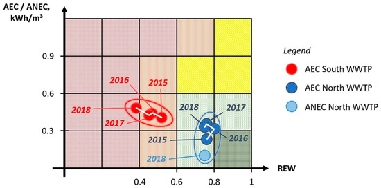 The second element for Q/E dependency pair was obtained using Equations (4) and (5). Result are shown in Table 5. We can observe equal AEC and ANEC values both for northern and southern WWTPs and years, except the 2018 for northern WWTP. The anaerobic digestion process at northern WWTP has been recently introduced with CHP-unit. In 2018, this unit has not yet been finished; however, we made a small approximation for EG indicator and included project performance (kWh) as input data.