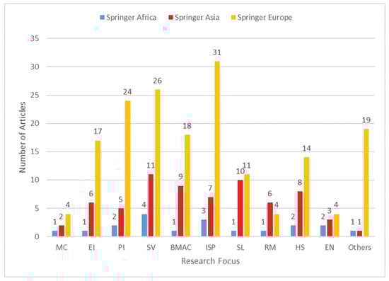 Of the 11 research domains identified, literature surveys had the highest number of published articles (eight), followed by “Roles of ICT and smart phones” (seven articles), while “Energy” and “Supply Chain/Logistics” had the lowest numbers of published articles, at three each. As stated in the previous section, we repeated the same processes for ITS in Asia and Europe. Figure 4, Figure 5 and Figure 6 give a graphical comparison of the number of articles published for each research domain in Elsevier, Springer and IEEE Xplore for the three continents (Africa, Asia and Europe).