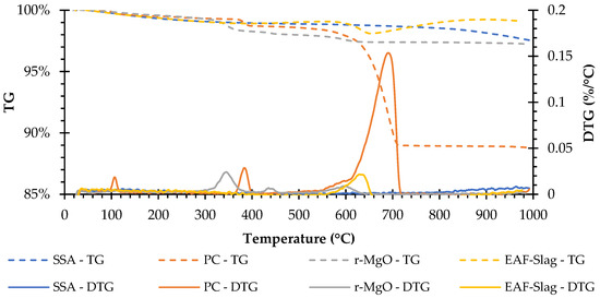 The SSA does not present clear peaks in DTG curves. The PC presents three well-defined peaks at about 110, 390, and 695 °C that may be respectively related to the dehydration of the calcium sulphate dihydrate (CaSO4 ⋅ 2H2O) [28,29,30,31], the dehydration of calcium hydroxide (Ca(OH)2) (350–500 °C) [30,32], and the decarbonation of calcium carbonates (CaCO3) (>500 °C) [28,29,30,33]. The r-MgO presents three peaks at about 350, 450, and 600 °C that may be respectively related to the dehydration of brucite [34], the decarbonation of HMCs (i.e., nesquehonite and hydromagnesite) [34], and decarbonation of magnesium carbonates (MgCO3) [35]. Finally, the EAFS presents one that seems to be related to the decarbonation of calcium carbonates (CaCO3) [28,29,30,32].