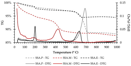Furthermore, the peak at about 690 °C on the DTG curve of SSA.P is attributed to the decarbonation of the limestone [29,32] present as an additive in Portland cement. The first weight loss, up to about 300 °C, of SSA.M may be related to the dehydration of HMCs formed, while the peak at about 425 °C is related to the decarbonation of the HMCs [34,36] and remained uncarbonated brucite [34]. In turn, the DTG curve of SSA.E presents two peaks, the first at about 200 °C may be related to dehydration of calcium aluminate and silicoaluminate hydrates (C–A–H and C–A–S–H) [37,38], while the second at about 635 °C is related to the decarbonation of calcium carbonates (CaCO3) [29,32,38]. Furthermore, the probable presence of C–A–H and C–A–S–H seems be associated to the chemical composition of the SSA and EAFS and to the lower reactivity to CO2 of the latter when compared to PC.