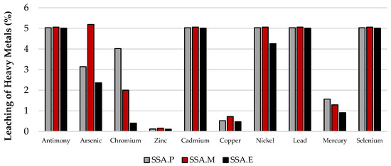 In most cases, the leachability of heavy metals, regardless of the material considered, is below detection level. This includes chromium, zinc, cadmium, copper, nickel, lead, and mercury. Therefore, the leachability of these metals in the test materials is at a level that constitutes an environmental hazard. The criteria for inert waste and sewage waste are met. In the case of antimony and arsenic, although their leachability was above the detection level, their contents are low enough that they similarly also meet all the criteria met by the previously mentioned heavy metals. In contrast, the highest level of leachability observed is for selenium from SSA ash. Relative to the total content, this amounts to 100%. In this case, the requirements for inert waste were not met, while this ash meets the criteria for non-inert waste and wastewater. It is worth noting that the level of selenium leaching from mortars is already much lower, at only 5%. In conclusion, the CO2-cured mortars with SSA content that were analysed, SSA.P, SSA.M, and SSA.E, meet the criteria for all waste materials including inert waste as well as for post-industrial wastewater as can be seen in Figure 7. Moreover, it was noticed that among the three CO2-cured mortars that the highest degree of immobilisation of the heavy metals tested was observed in the SSA.E mortar, in which this property is most visible in the case of arsenic, chromium, copper, nickel, and mercury as can be observed in Figure 6.