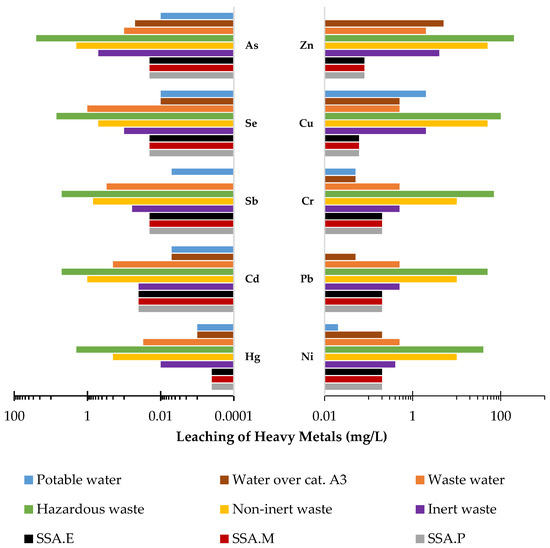 The total heavy metal content of the SSA ash and all mortars containing the waste material is presented in Table 4. The leachability of heavy metals from CO2-cured mortars is collectively presented in Table 5. Based on the information obtained, the leachability percentages were calculated for each metal (Table 6) and visualised in Figure 6. Table 7 summarises the requirements of the Polish regulations based on European directives: (i) Journal of Laws of the Republic of Poland, item 1277/1.09.2015—Regulation of the Minister of Economy of 16 July 2015 on the approval of waste for landfills [42]; (ii) Journal of Laws of the Republic of Poland, item 984 n˚. 137/2006—Regulation of the Minister of Environment of 24 July 2006 on the conditions to be met when introducing sewage to waters or to the ground, and on the substances that are particularly harmful to the aquatic environment [43]; (iii) Journal of Laws of the Republic of Poland, item 1747/29.08.2019—Regulation of the Minister of Maritime Affairs and Inland Navigation of 29 August 2019 on the requirements to be met by surface waters used for supplying the population with water intended for human consumption [44]; and (iv) Journal of Laws of the Republic of Poland, item 2294/7.12.2017—Regulation of the Minister of Health of 7 December 2017 on the quality of water intended for human consumption [45].
