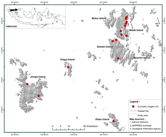 The Anambas Archipelago MPA is a district comprising a cluster of small islands situated in the southern South China Sea, between 2°10′0”–3°40′0” N and 105°15′0”–106°45′0” E. It is one of the sea frontier areas of Indonesia and shares its borders with the Vietnam exclusive economic zone (EEZ) lines in the north and the Malaysia EEZ lines in the west and east. It is closer to Malaysian (201 km) or Singaporean territorial land (215 km) than its provincial capital city (Riau Province, 320 km). Survey and interview activities were carried out in 15 villages of the seven sub-districts to cover the possible variability of the population within the Anambas archipelago (Figure 1). The surveyed villages were selected to represent the five main/important islands (Siantan, Jemaja, Telaga, Kiabu and Matak Islands) in the Anambas Archipelago, the main settlement of populations and the sub-district administrative boundary. Figure 1 and the locations of surveyed villages were created using ArcGIS ver.10. Fieldwork was carried out over four months, including the preparation and survey activities, from July to November 2014.