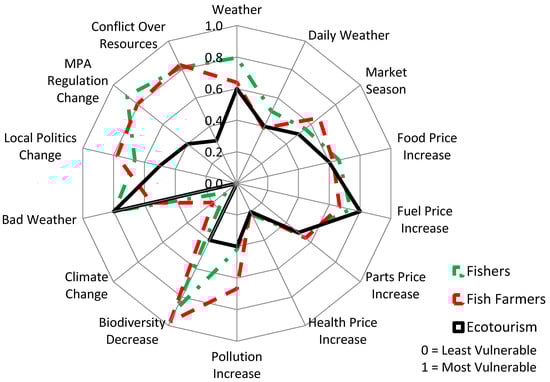 The perceived high levels of vulnerability on LVIs related to natural resource use were clearly expressed by fishers and fish farmers. Conflicts with foreign and local fishers, MPA fishing limitations, sudden bad weather and biodiversity degradation have been difficult to anticipate by both households. The inability to respond and adapt to these shock indicators might increase the sensitivity of the livelihood to other types of vulnerability risks [40]. Fish farmers are, in some ways, affected similarly to fishers because part of their daily routines involves fishing as an alternative livelihood. Furthermore, the apparent low vulnerability that was felt by ecotourism households on these LVIs was predominantly due to their activities being unrelated to fisheries resources.
