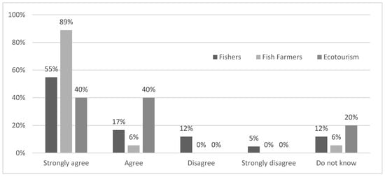 Most of the three household groups strongly agreed that the Anambas MPA will give some benefits for the island community (Figure 4), even though some of the respondents stated or indicated that they did not know of the existence of the Anambas MPA at the beginning. A significant number of fishers (25%) also disagreed with the establishment of the Anambas MPA, yet the majority of them (72%) agreed with the potential benefits of the MPA. Fish farmers and ecotourism operators also expressed a change in attitude towards the benefits of the MPA, although not as strongly as in fisher households. The shift of responses among the household groups in favour of the MPA was clearly evident throughout the interview process.