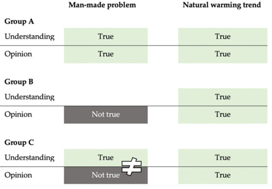 Participants in Group C (n = 2) differed from Groups A and B because they were not consistent in across their understandings and opinions of global warming. They first agreed with the man-made explanation (True) alongside the natural warming trend explanation (True), but refuted the man-made explanation (Not true) in their explanation, leaving the natural warming trend (True) as the only valid explanation for global warming in the end. Based on this explicit inconsistency, it seems that the two participants had been willing to censor the disbelief they later expressed in their opinions when they initially referenced human activity as a component of global warming in their conceptions. Based on this explicit inconsistency (depicted by the ‘not equal’ sign in Figure 1), it appears that the two participants censored the disbelief they later expressed in their opinions when they initially referenced human activity as a component of global warming.