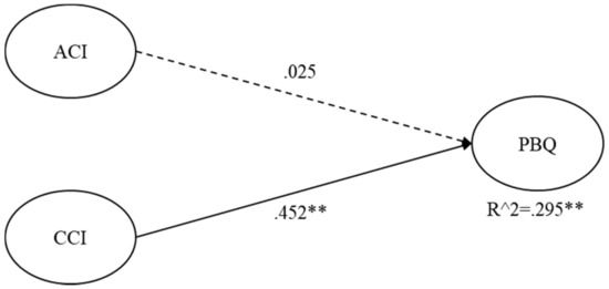 The results of correlation analysis among variables are shown in the following Table 3. First, the correlations between PBQ and exogenous variables were all analyzed to be significant. Specifically, the relationship between CCI and PBQ was .510 (p < .01), showing the highest correlation. The correlation between ACI and PBQ was also high at .460 (p < .01).