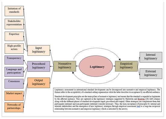Standard-setting organisations strive for legitimacy to enforce the acceptance and implementation of the developed standard [12]. The reason is that “contrary to governments who can use violent force to ensure law compliance, voluntary private governance initiatives rely mostly on legitimacy to ensure compliance” [12], for critical reflections see [29]. The term legitimacy has numerous definitions and encompasses multiple dimensions, depending on the author and context, but there is a common distinction between normative and empirical legitimacy [12,14,30,31,32].