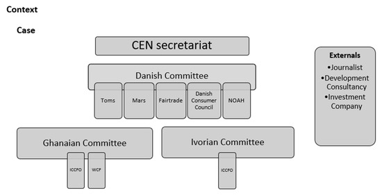 Aligned with the literature in the global value and commodity chains research, we rely on a case study approach. Following Yin, a case study is a preferred strategy when the research aims to explain a complex contemporary research phenomenon with limited control over the boundaries of the study object, as it is the case in this paper [41]. More specifically, we apply a holistic case study approach, see Figure 2. The CEN secretariat gives a holistic view of the organisational structure. The embedded units of analysis are the Danish, Ghanaian and Ivorian committee with their respective participating stakeholders. The part of the study allows for analysing the process related to internal legitimacy. ISO/CEN is embedded in the external context, and hence the research includes interviews with experts not participating in the development of the ISO/CEN standard to assess the external processes about the creation of legitimacy. All informants are thus purposefully selected.