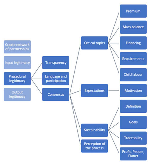 An exploratory study as this cannot rely on established data sets and/or survey data, and the complexity of the research also suggests a need for applying an open-ended research methodology allowing for iterations between theory and empirics (i.e., an abductive approach). Hence, we collected qualitative data via semi-structured interviews with a total of twelve informants [43]. The structure of the interview guide corresponds to the triple composition in input, procedural and output legitimacy, which has been explained in more detail in the literature review. Different emphases have been chosen depending on the interviewee. The interviews were transcribed and coded. Coding refers to the systematic classification of themes in empirical data [44]. The qualitative data analysis software Nvivo has been chosen as a tool for coding. In line with the abductive research approach, we used “sensitising concepts” in the form of input, procedural and output legitimacy and the corresponding seven suggested legitimacy strategies by Hallström and Boström to structure the primary qualitative data [28,40]. In Nvivo coding is stored in so-called “nodes” which have been created for the pre-selected concepts. In the next step, each transcribed interview has been coded according to the established nodes, but also regarding possible subcategories, so-called “child nodes” in Nvivo, see Figure 3 for the presentation of the tree of codes.