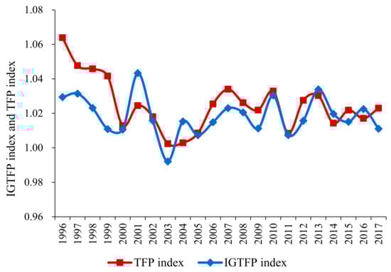 Changing trend of IGTFP index and TFP index in China from 1995–2017.