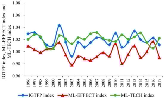 Changing trend of IGTFP index, ML-EFFECT index and ML-TECH index in China from 1995–2017.