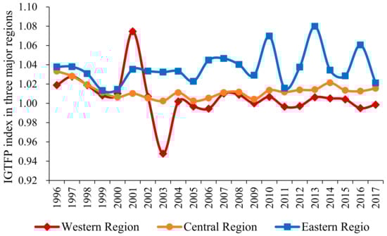Changing trend of IGTFP index in three major regions of China from 1995–2017.