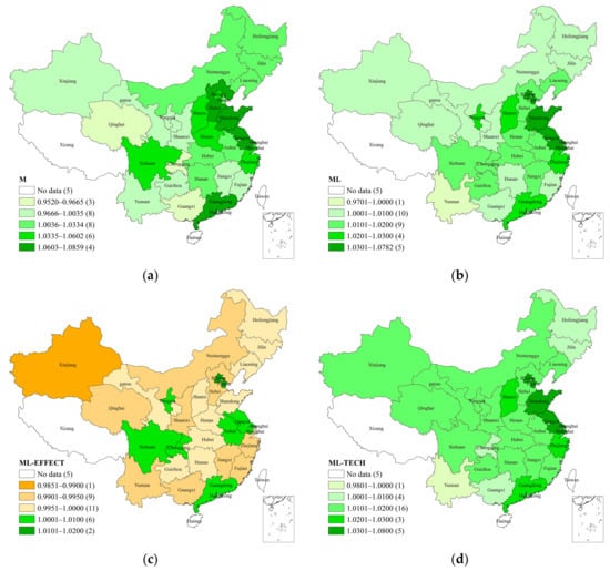 TFP index, IGTFP index, ML-EFFECT index and ML-TECH index of China’s province from 1995–2017. (a) TFP index; (b) IGTFP index; (c) ML-EFFECT index; (d) ML-TECH index.