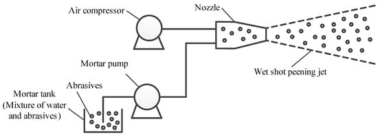 Wet shot peening (WSP) cleaning technology is based on dry sandblasting. It uses the advantages of high-pressure water jet and dry sandblasting to spray abrasives and water together onto the substrate’s surface []. According to the mixing sequence of abrasive and water, it can be divided into pre-mixing and post-mixing modes. The pre-mixing mode is adopted in this study, where abrasive and water are mixed first and then sprayed out through the nozzle. The WSP method uses compressed air as the power source like dry sandblasting [] and uses the effects of grinding, friction, shearing of high-speed abrasives [] and the wedge effect of water to remove surface paint dirt. To a certain extent, it can improve the fatigue strength of materials [,].