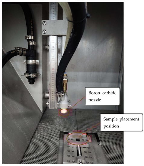 Figure 1 and Figure 2 show the cleaning equipment and the working principle of WSP. As shown in Figure 1, the abrasives and water are fully mixed in the mortar tank, and move forward under the push of the mortar pump. When it reaches the scope of action of the air compressor, the air compressor (maximum pressure is 0.65 MPa) generates a certain pressure, which pushes the mixture of abrasive and water to move to the nozzle and finally shoots out from the nozzle. In Figure 2, the nozzle can move horizontally and up and down to adapt to different cleaning distances and moving rate, etc. Placing the part to be cleaned at the sample placement position, and the nozzle moves to clean the paint on the surface of the substrate.