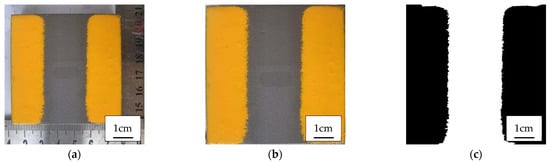 B. Use the image processing software to cut the captured picture to a unified and suitable size (Figure 3b), making the substrate and the paint part form black and white parts with a large color difference (Figure 3c);