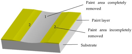 The total mass removed during the WSP cleaning process comprises the masses of the paint and substrate removed. The mass of the paint removed includes the paint removed completely and incompletely. Figure 4 shows that complete paint removal is a prerequisite for substrate removal. The incomplete removal of paint means that the impact energy of the jet periphery on the paint dirt is limited; thus, the uppermost layer of the paint is removed while the substrate is unexposed. The mass ratio of the paint removed completely is theoretically equal to the mass of the removal area. Therefore, the ratio of the removal mass always exceeds the ratio of the removal area.