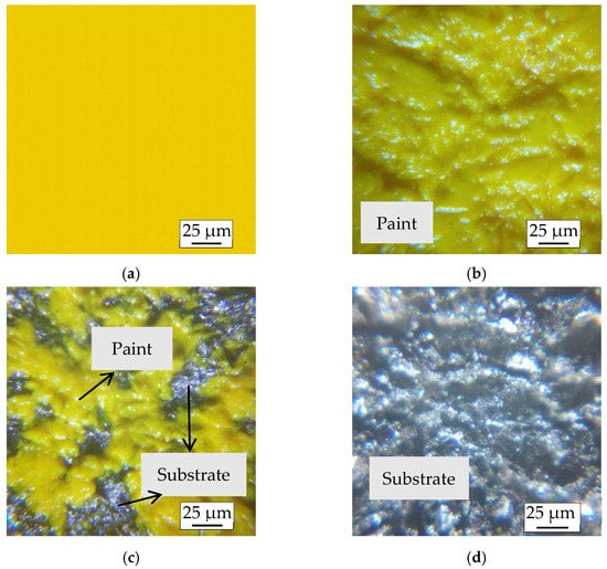The cleaned sample carried a painted surface that is incompletely removed, and the incompletely and completely removed areas constitute the contact area of the jet. When the instantaneous impact energy is small, the layer-by-layer paint removal phenomenon is more obvious. Under the experimental conditions of 0.25 MPa pressure, 100 mm stand-off distance, 5 mm/s traverse rate, and other wet peening parameters remain unchanged; as the cleaning times increase, the paint was continuously removed. An optical microscope with magnification of 400 times was used to observe the paint surface at the same position with different cleaning times. The change of paint surface morphology was shown in Figure 6. When the cleaning times of wet shot peening is once, the top layer of the paint is removed, and the paint surface becomes uneven (Figure 6b). As the cleaning times increase, the paint is incessantly removed, and finally, the substrate is completely exposed.