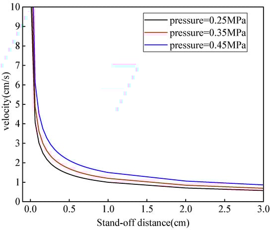 The pressure determines the instantaneous velocity of the jet center when the jet is ejected from the nozzle. The greater the pressure, the higher the velocity; Figure 7 shows the relations diagram of the three factors. Taking the nozzle exit position as the starting point; i.e., zero on the abscissa. The figure only shows part of the whole. According to the trend of change, we can also see that with the increase of target distance, the velocity is infinitely close to 0.