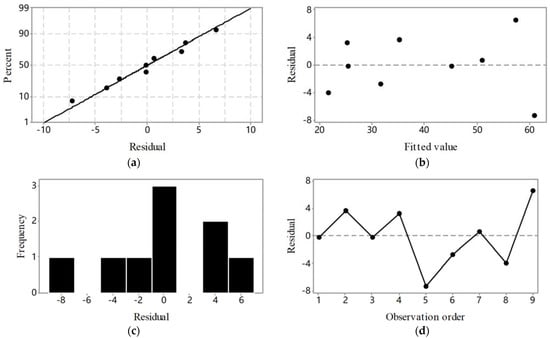Residual plots for cleaning efficiency. (a) Normal probability plot of residuals, (b) Residual versus fitted values, (c) Histogram of residuals, (d) Residual versus order of data.
