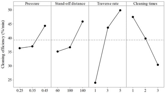 Through the cleaning efficiency analysis, the level trend graph of each factor is drawn (Figure 9). The relationship between the parameters and the cleaning efficiency is consistent with the regression equation, verifying the model’s correctness. Therefore, to improve the cleaning efficiency, the pressure, stand-off distance, and traverse rate should be increased, and the cleaning times should be reduced. The degree of influence of each factor on the experimental index can be evaluated by the magnitude of the range (R). Evidently, RC is the largest, indicating that the traverse rate has the greatest influence on cleaning efficiency, followed by RD, and finally RA and RB with similar R values, suggesting that the pressure and stand-off distance within the experimental range slightly affect the cleaning efficiency. Therefore, the order of the degree of influence is traverse speed > cleaning times > stand-off distance > pressure.