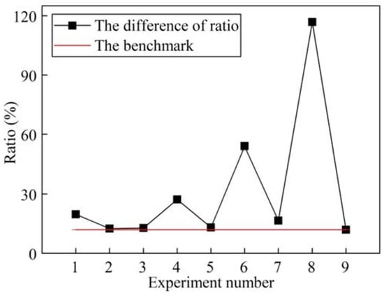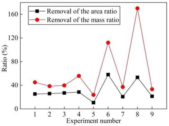 The comparison chart of removal mass and area ratio of the nine groups of experiments is shown in Figure 10. The overall change trend of the ratio of the removal mass and area is basically the same, corresponding to both. However, compared with other groups, the R-mass of the sixth and eighth groups of experiments are special. Compared to the data in Table 6, these two groups of removal mass accounted for 112.11% and 170.14%, respectively, which both exceed 100%. This situation indicates that there must be a removal of the substrate material under these two sets of experimental conditions. This situation should be avoided as much as possible in the actual WSP cleaning work.