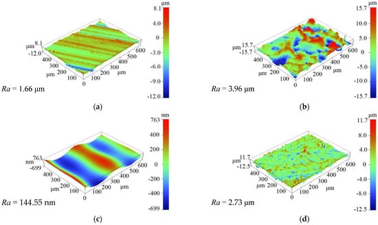 Variation of sample surface roughness value. (a) Untreated, (b) After pretreatment by dry sandblasting, (c) After painting, (d) After wet shot peening cleaning.