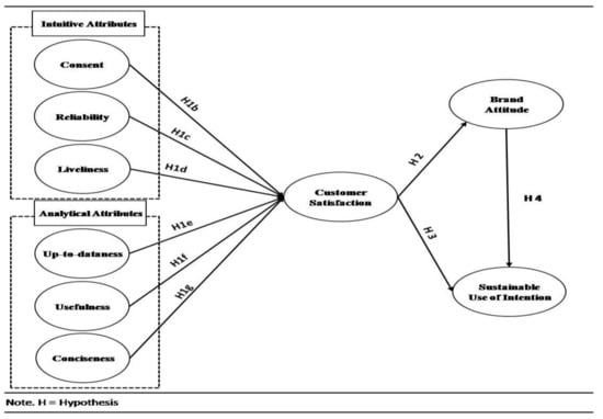 Brand attitude is a stable and continuous characteristic for predicting and understanding consumer behavior such as choosing a brand or motivating purchase behavior. Previous studies verified that customer satisfaction can directly influence brand attitude as well as purchase intention. For example, Byun, Kim, and Lee (2013) [] verified the significant relationship between information factors and brand attitude from family restaurant consumers. Taylor and Hunter (2014) [] identified the direct relationship between e-satisfaction and loyalty from consumers, and the e-satisfaction loyalty relationship appears to be mediated by brand attitudes in this study. In addition, Hwang, Choe, Kim, and Kim (2021) [] investigated the antecedents and consequences of satisfaction as perceived by customers who used a coffee shop operated by robot baristas and customers who used a coffee shop operated by human baristas. The study demonstrated that consumer satisfaction has a significant impact on bran attitude as well as loyalty.As such, studies on the relationship between customer satisfaction and brand attitude by applying SNSs were insufficient, but several previous studies assumed that customer satisfaction could have a direct effect on brand attitude. Therefore, the current study established the following hypothesis.