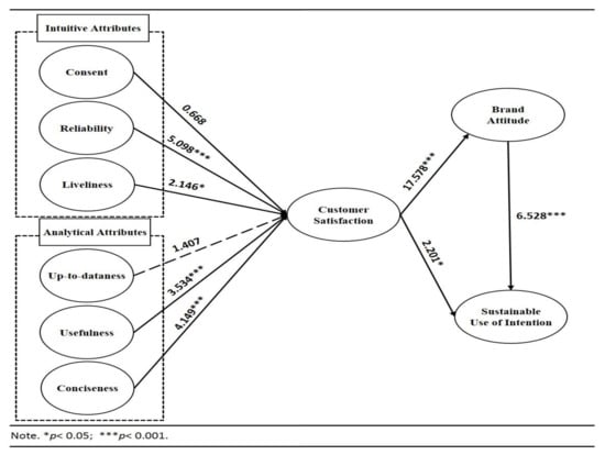 First, this study applied the attribute of SNS information characteristics to the dual processing theory that verified the causal relationship between satisfaction, brand attitude, and sustainable use intention through the SNS information perceived by restaurant visitors. In particular, previous studies that used dual processing theory mainly applied the concept to identify the effectiveness of SNS information in the engineering field [,] or in studies on psychological aspects to understand the psychology of consumers []. Therefore, this study identifies the important elements of SNS information attributes as an important marketing promotion strategy by considering various intuitive (consent, reliability, liveliness) attributes and analytical (up-to-dateness, usefulness, conciseness) attributes that consumers can recognize through SNSs in the restaurant.