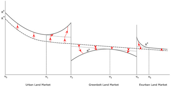 If the land is homogenous and there are no restrictions limiting development, the bid rent function, represented in Figure 4 by the curve Rm, decreases smoothly with increasing distance [9]. The establishment of a greenbelt divides the curve into three segments, pushing Rm upwards out of the greenbelt (between u0 and u2 and beyond u4) and pushing Rm downwards within the greenbelt (between u2 and u4). The upwards movement out of the greenbelt is due to the total reduction of the supply of developable land; the downwards movement within the greenbelt is due to the restriction, which prevents development. This effect is illustrated by the curve Rg.