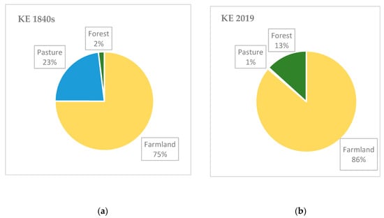 The distribution of different land-use types accounted for the total area: (a) KE 1840s; (b) KE 2019.