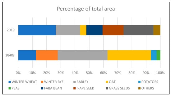 Percentage of total area used for different crops 1840s (data from 1841, 1843) and 2019 [39,42].