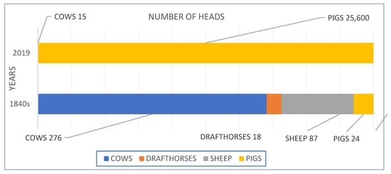 KE’s historical livestock lists provide information on the number of dairy cows, bulls and oxen registered at KE in the years 1839 and 1844 [66,67]. In the KE farm system, sheep were mainly present at peasant farms as confirmed by the land-rent [68]. When the 1840s are compared to 2019, a significant change in the livestock composition becomes clear as 2019 is distinguished by a focus on specialized pig production (see Figure 3). The amount of cows and oxen decreased significantly over time, while pig production was the main focus of production in the 2019 system.