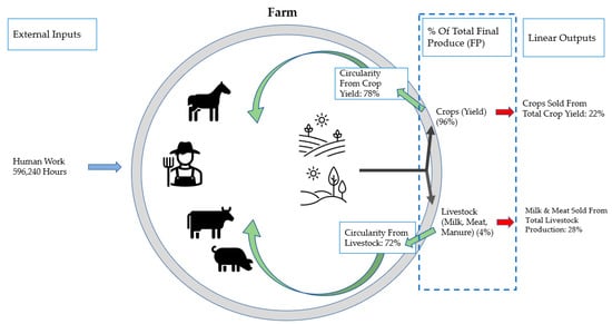 Attributes of flows of the KE Agro-Ecosystem 1840s: External inputs to the farm distributed into Final Produce (FP) and from there into circularity or linear output respectively.