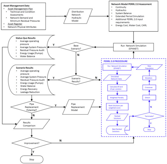 The methodology of the study can be outlined as shown in Figure 1. To meet the study objective, the PERRL 2.0 procedure was used to evaluate the energy recovery and leakage reduction potential within the Stellenbosch Water Distribution Network, and the subsequent effects the installation of the recommended energy recovery devices would have on the operation of the network.
