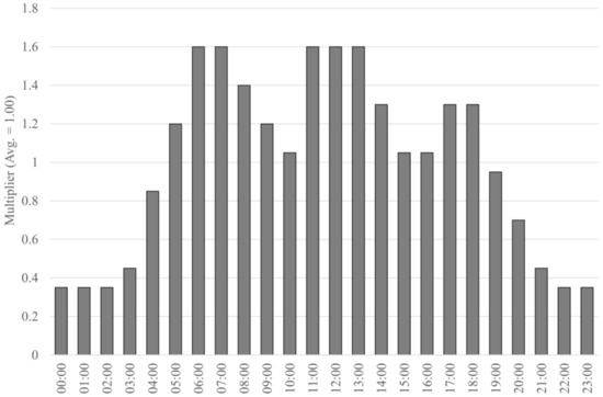 Several amendments to the current Stellenbosch LM Water Distribution Network Model were required to optimally run the PERRL 2.0 procedure and analyse and evaluate the energy recovery and leakage reduction potential in the network through the installation of energy recovery devices. The most prominent change was the introduction of a demand pattern to enable the extended period simulation employed by the GA within the PERRL 2.0 procedure. Standard residential demand patterns, for the applicable levels of service, were used for the extended period simulation similar to the demand pattern employed by Bonthuys et al. [34] (Figure 3).