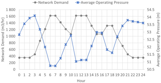 Figure 4 shows a comparison of the average operating pressure of all consumptive nodes and the consumed flow within a 24-h modelled operation of the network.