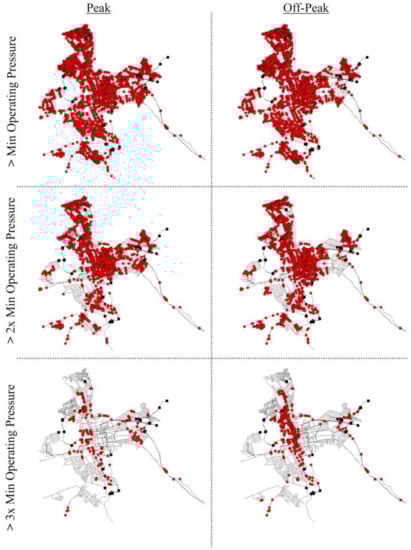 Figure 5 shows the distribution of the hourly operating pressure at consumptive nodes in the system during both peak (06h00—07h00) and off-peak (22h00—02h00) times. From Figure 5 the median of the peak and off-peak operating pressures can be calculated as 50.8 m and 53.3 m, respectively. In both instances, more than 90% of the consumptive nodes are operating at pressures above the acceptable minimum residual pressure, and more than 50% are operating above double the acceptable minimum residual pressure, further indicating the potential for energy recovery within the system. Figure 6 shows the spatial distribution of different operating pressure ranges for the base scenario of the Stellenbosch Town DMA during peak and off-peak operations. As it can be seen, there is a significant percentage of the consumptive nodes characterized by operating pressure values exceeding double the inferior limit and a number of them with operating pressure values exceeding the triple of the inferior limit.