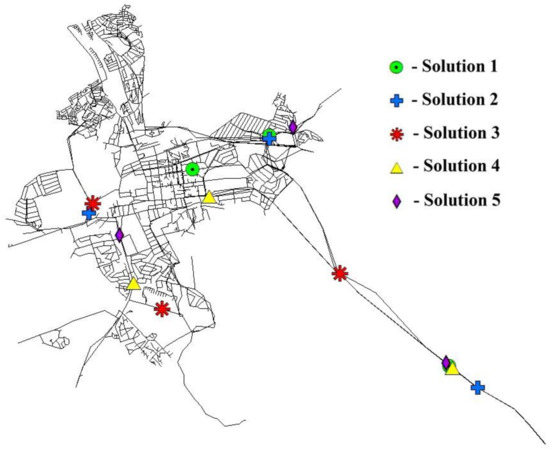 Scenario 2—Solution comparison. The three individual energy recovery locations (sites) are indicated in terms of the numerical sequence assigned to the pipes at which the installations are proposed.